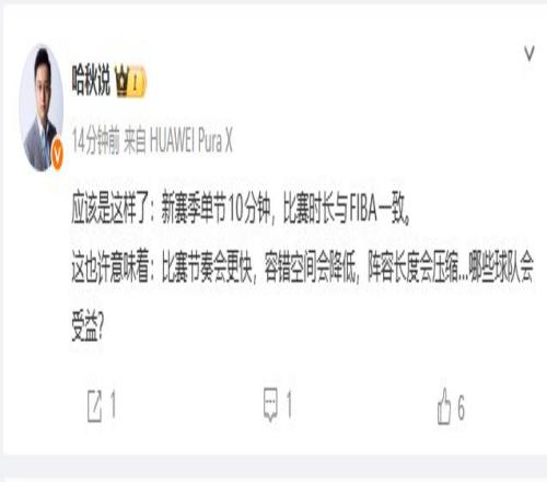 哈秋說:應該是這樣了:新賽季單節(jié)10分鐘,比賽時長與FIBA一致。