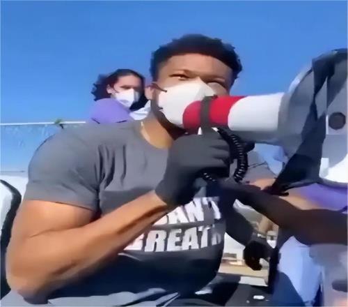 除了現(xiàn)場(chǎng)喊話表示支持之外,字母哥還跟隊(duì)友們一起穿上了“我不能呼吸”的T恤,同時(shí)買(mǎi)了很多物資。