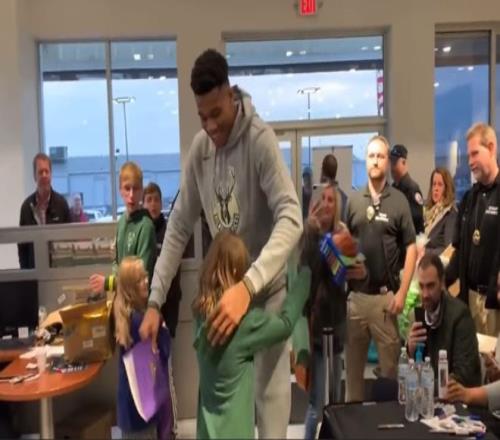 看到小女孩激動(dòng)落淚后,字母哥也是趕緊去安撫女孩的心情,還與小女孩一起合影留念。